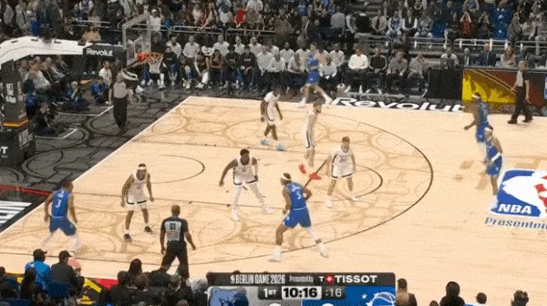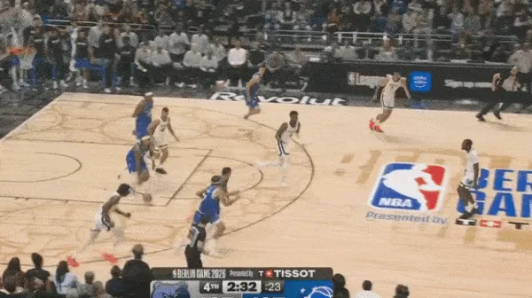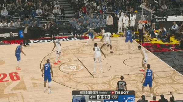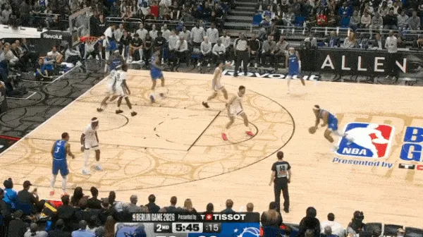 转换进攻布莱克持球过半场后见阿尔达马放两步防突放投,立即使用胯下拉回衔接撤步持球三分惩罚。
