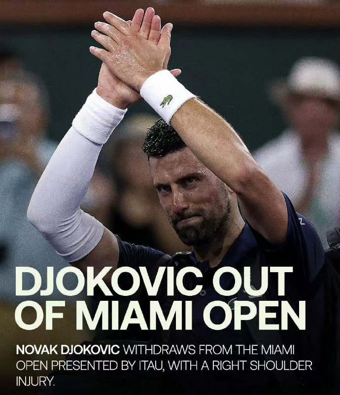 我们首先来关注一条最新消息。北京时间今晨,有外媒报道,称塞尔维亚球王德约科维奇因右肩伤势,已经决定退出即将开打的ATP1000迈阿密大师赛。在印第安维尔斯,德约科维奇就一直戴着护臂打比赛,并确认前臂有些不适。如今,他的肩部再添伤病,也就是说右臂都有些问题了。好好养伤吧!养好身体,红土赛季再见!